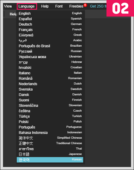 영어가 불편하다면 상단 탭에서 language -> 한국어를 선택해 주면 된다.