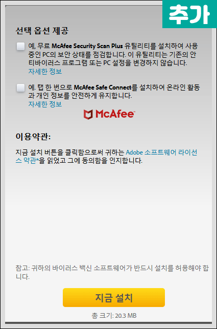 이 때 플래시 표시와 함께 설치 안내가 나온다면 선택옵션을 체크해제후 지금설치를 누르면 된다.